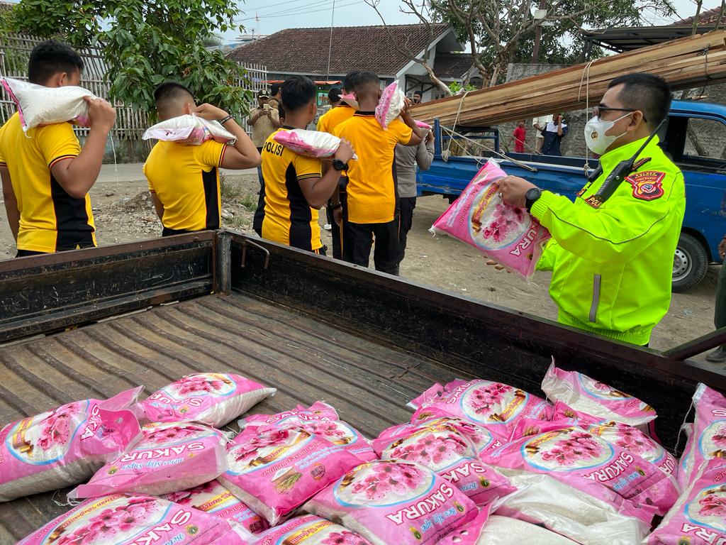 Setibanya di Madrasah Baitun-Nur, personel Polres Karawang langsung menurunkan dari mobil bak bantuan yang telah disiapkan sebelumnya seperti bahan-bahan matrial, serta membagikan beras dalam kemasan kepada masyarakat setempat.