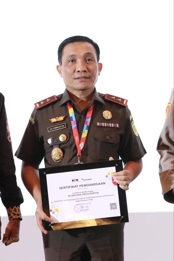 Kepala Kejaksaan Tinggi Banten Leonard Eben Ezer Simanjuntak menerima penghargaan yang diberikan oleh Komisi Pemberantasan Korupsi (KPK) kepada Kejaksaan Tinggi Banten atas Penghargaan Penanganan Tindak Pidana Korupsi Terbaik Pertama Tingkat Kejaksaan Tinggi.
