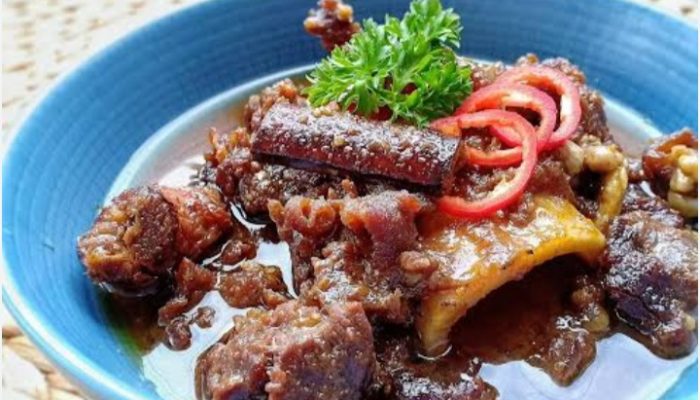 Daging kambing yang dimasak dengan bumbu khas, mirip semur, tetapi lebih kaya dengan rempah-rempah.