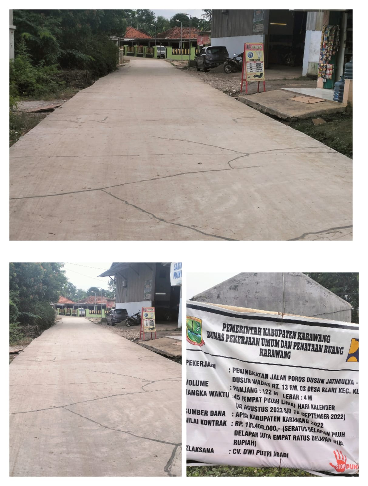 Hal ini seperti proyek peningkatan jalan poros desa Klari kecamatan Klari kabupaten Karawang Jawa barat yang lokasinya di dusun Jatimulya – dusun Wadas RT 13/ 03 yang baru selesai di kerjakan oleh pihak kontraktor yang menggunakan CV Dwi Putri Abadi.