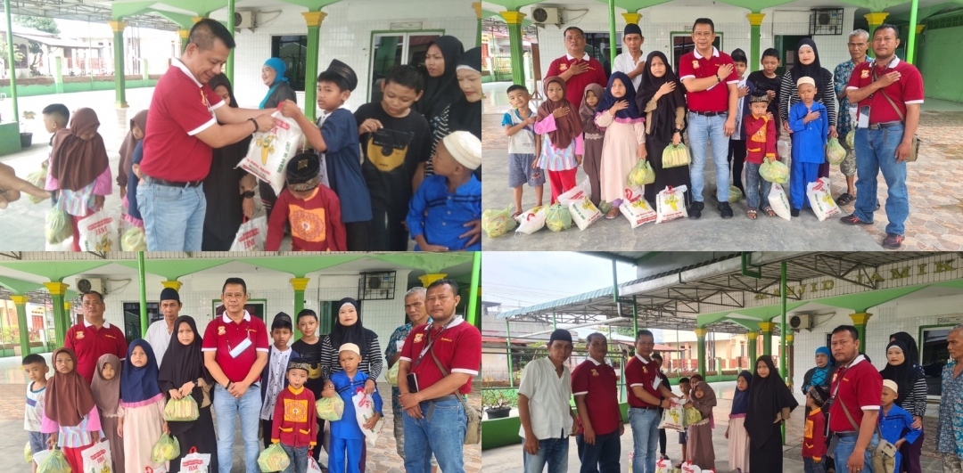 Pembagian sembako berupa beras dan mi instan diserahkan oleh Pimpred Pewarta.co satu persatu kepada anak yatim dan fakir miskin di halaman masjid tersebut.
