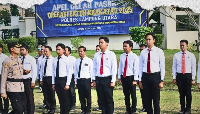 LAMPUNG UTARA II ONTV.CO.ID – Bupati Lampung Utara, Dr. Ir. Hamartoni Ahadis, M.Si., diwakili oleh Asisten I Bidang Pemerintahan dan Kesejahteraan Rakyat, Man Kodri, S.H., M.M., CPIA, menghadiri Apel Gelar Pasukan Operasi Patuh Krakatau 2025 yang dilaksanakan di halaman Mapolres Lampung Utara, Senin (14/07/2025).