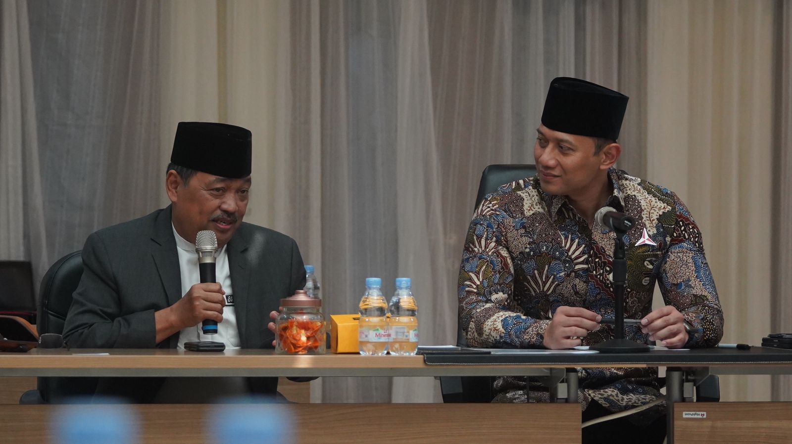 AHY yang mengenakan batik berpeci hitam duduk berdampingan dengan Kyai Andi, Mantan DPR RI, mengenakan jas hitam berpeci, dikelilingi oleh sejumlah tokoh dan aktivis NU nasional dan daerah. AHY menyambut hangat dengan sumringah.
