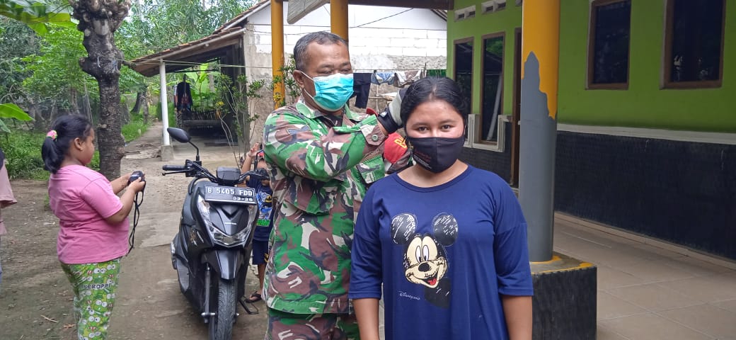 BEKASI||ONTV.CO.ID – Personel Bintara Pembina Desa (BABINSA) Koramil 03/Cabangbungin Sertu Martan yang bekerja sama dengan Pemerintah Desa Pantai Bahagia, melaksanakan anjangsana ke rumah-rumah warga binaannya sekaligus memberikan masker dan sembako (Beras) terutama yang terkena dampak Pandemi Covid-19 yang berlokasi di Kampung Biyombong RT 01 dan 02 RW 01 Dusun 1 Desa Pantai Bahagia, Kecamatan Kabupaten Bekasi, Jum’at (18/06/2021).