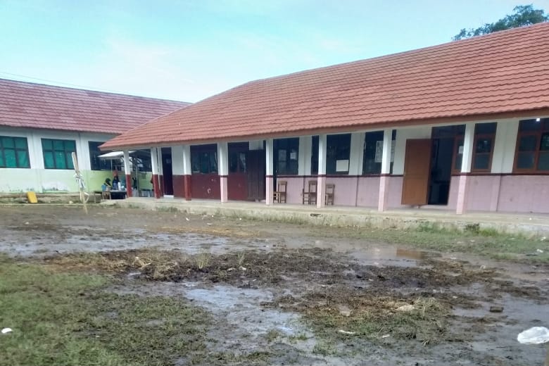 “Selain becek dan berlumpur, halaman tersebut juga licin sehingga dapat beresiko pada anak-anak kami,’” ujar salah seorang wali murid yang tidak ingin disebutkan namanya.