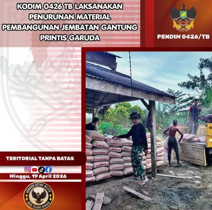 MESUJI TIMUR LAMPUNG II ONTV.CO.ID — Komando Distrik Militer (Kodim) 0426 Tulang Bawang kembali menunjukkan peran aktifnya dalam mendukung pembangunan infrastruktur daerah. Pada Minggu (19/04), jajaran Kodim melaksanakan kegiatan penurunan material pembangunan Jembatan Gantung Printis Garuda di Desa Pangkal Mas Jaya, Kecamatan Mesuji Timur, Kabupaten Mesuji. Minggu,19 April 2026.