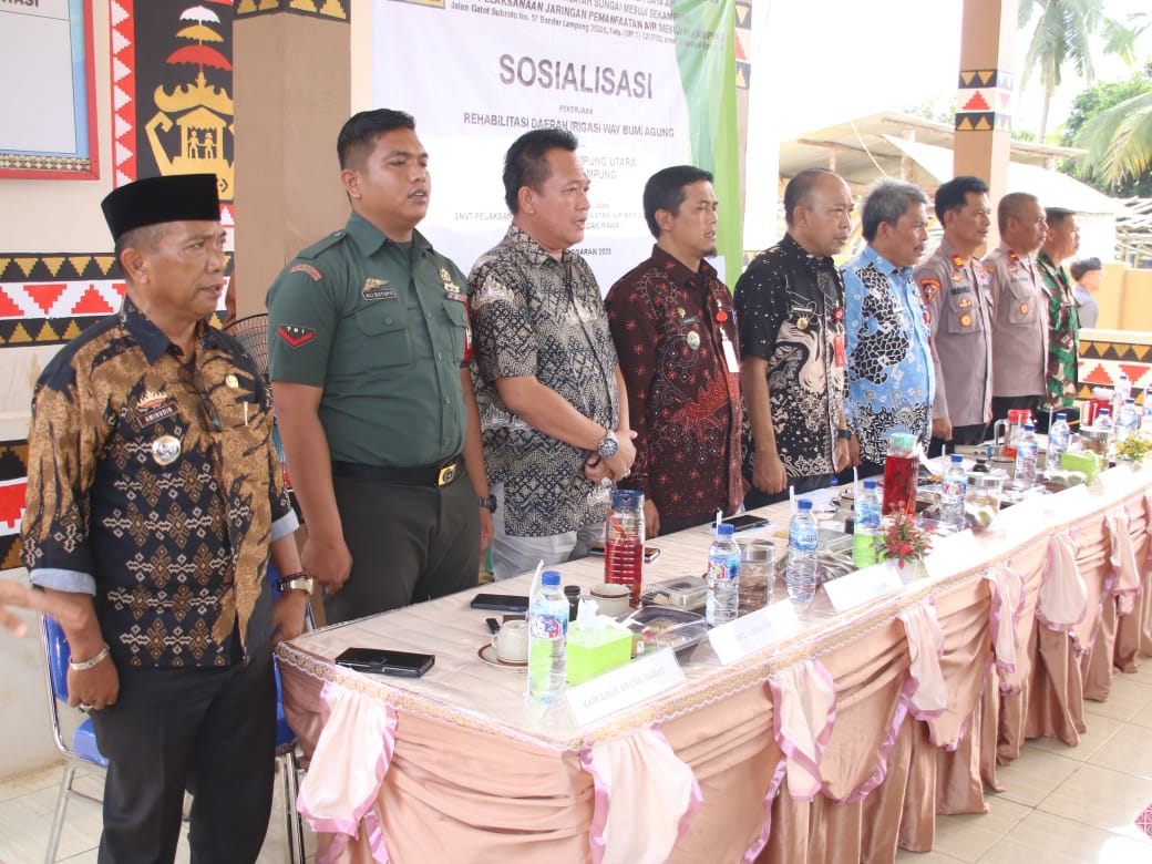 LAMPUNG UTARA II ONTV.CO.ID — Sungkai Jaya, 19 Juni 2025 — Pemerintah Kabupaten Lampung Utara menghadiri kegiatan Sosialisasi Pekerjaan Rehabilitasi Daerah Irigasi Way Bumi Agung yang dilaksanakan oleh Kementerian Pekerjaan Umum dan Perumahan Rakyat (PUPR) melalui Direktorat Jenderal Sumber Daya Air, Balai Besar Wilayah Sungai Mesuji Sekampung. Acara digelar di Kantor Desa Sri Agung, Kecamatan Sungkai Jaya, Kamis (19/06/2025).