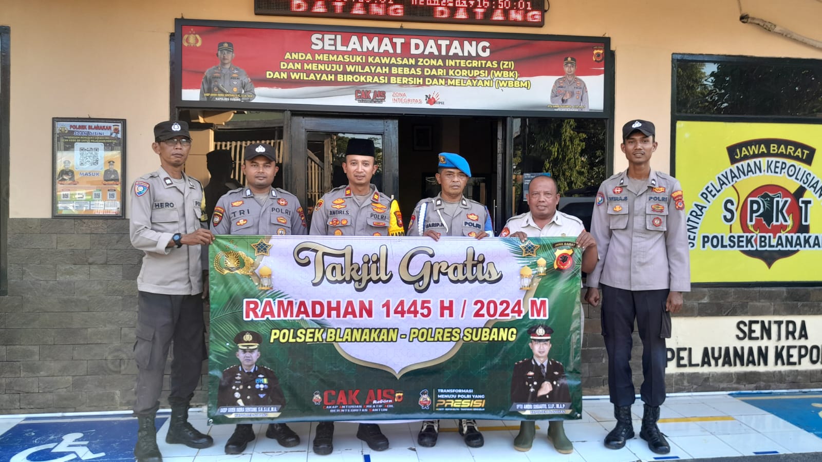 Atas arahan dan petunjuk Kapolres Subang AKBP Ariek Indra Sentanu, S.H., S.I.K., M.H., pada hari Rabu sore (20/04/2024), Kapolsek Blanakan Iptu Andri Sugiarto, S.I.P., M.A.P., berserta anggota membagikan takjil gratis untuk pemgendara yang melintas di depan Mako Polsek Blanakan.
