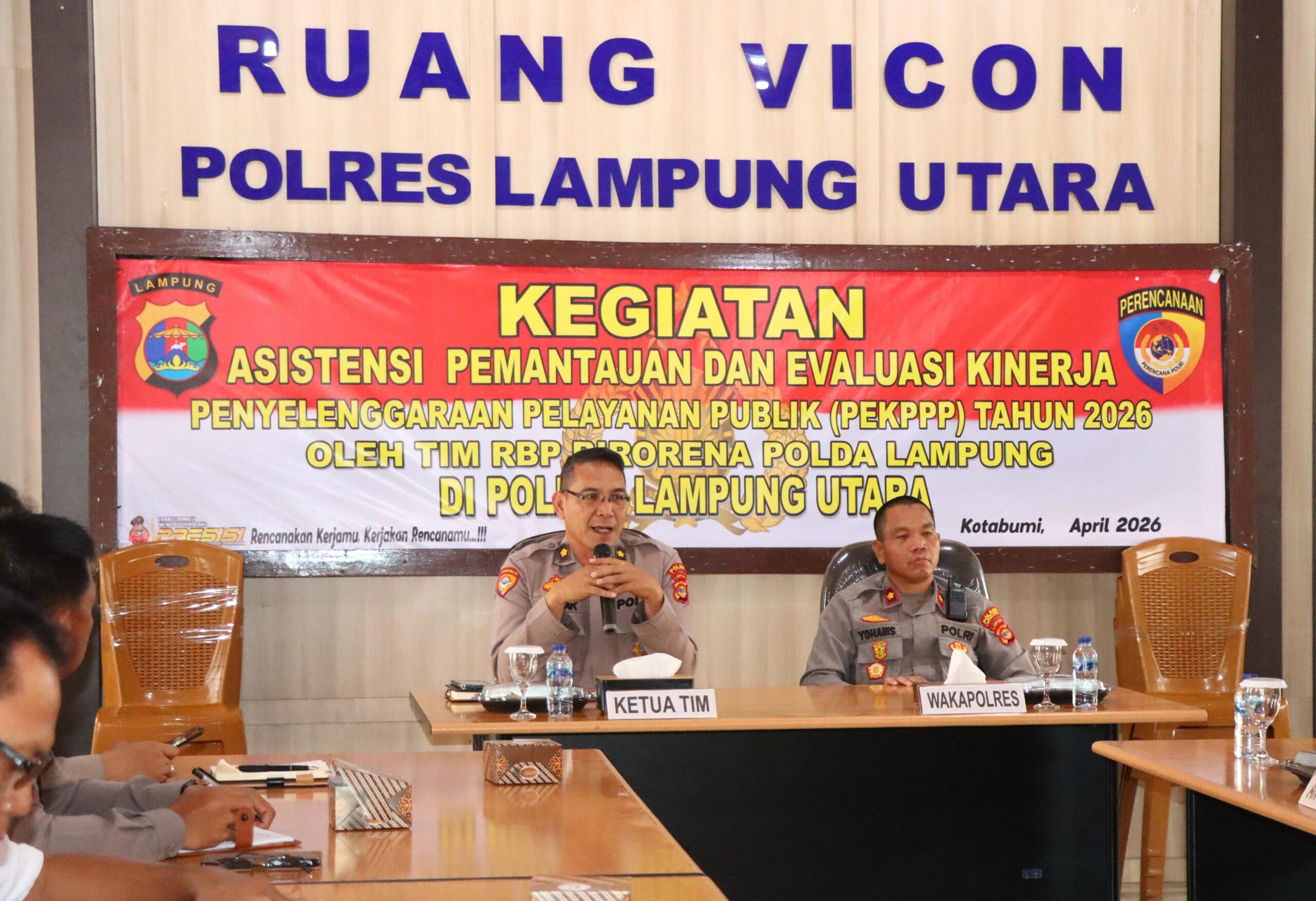 LAMPUNG UTARA II ONTV.CO.ID — Biro Perencanaan (Rena) Polda Lampung melaksanakan kegiatan asistensi pemantauan dan evaluasi kinerja penyelenggaraan pelayanan publik Tahun 2026 di Polres Lampung Utara. Kegiatan tersebut berlangsung di Aula Vicon Polres Lampung Utara, Senin (20/4/2026).