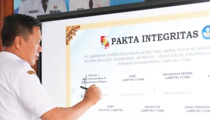 LAMPUNG UTARA II ONTV.CO.ID – Pemerintah Kabupaten Lampung Utara menggelar kegiatan sosialisasi dan penandatanganan fakta integritas Sistem Penerimaan Murid Baru (SPMB) untuk jenjang Taman Kanak-Kanak (TK), Sekolah Dasar (SD), dan Sekolah Menengah Pertama (SMP), Rabu (22/4/2026).