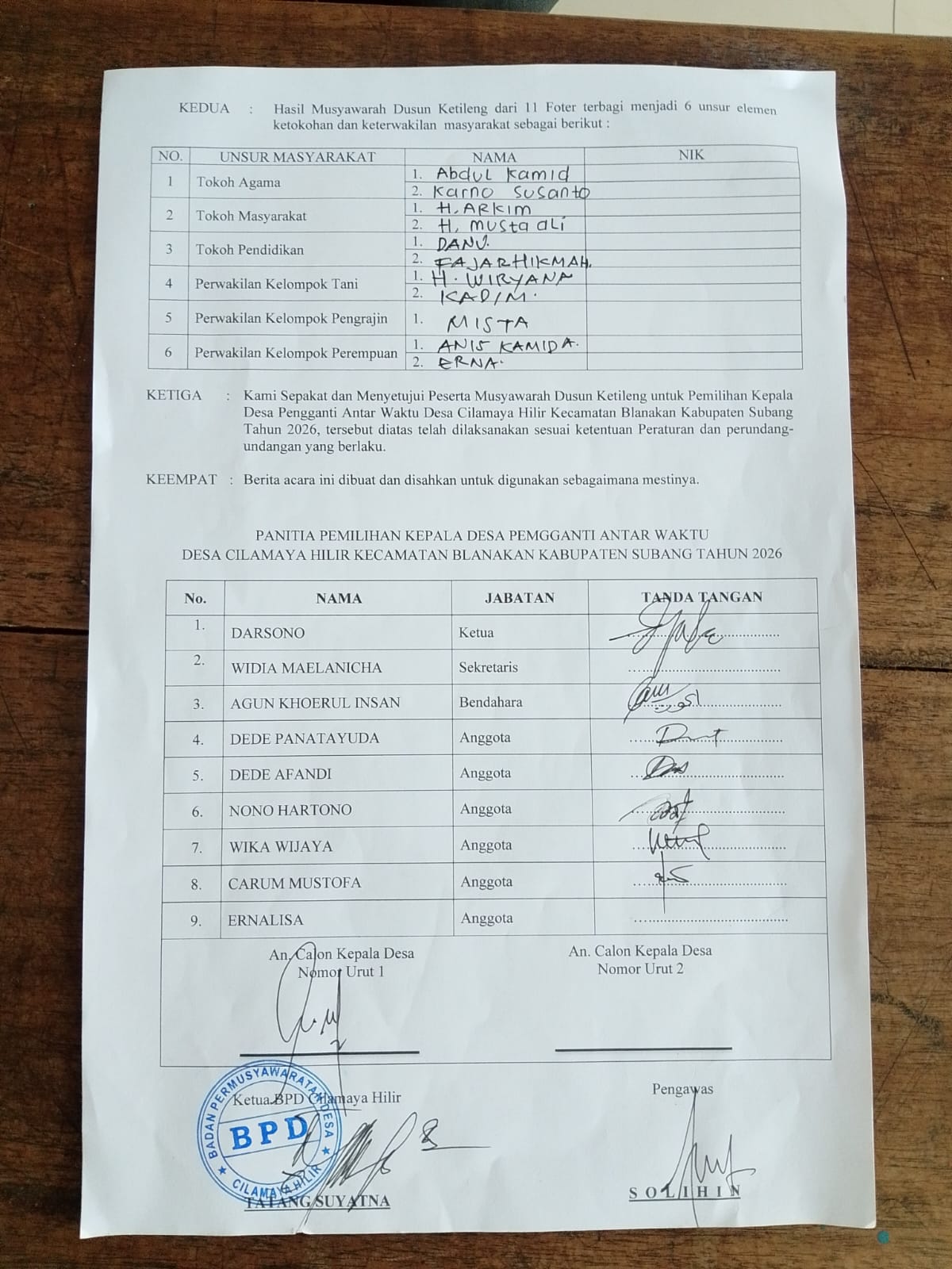 SUBANG-JAWA BARAT || ONTV.CO.ID – Panitia Pemilihan Kepala Desa Pengganti Antar Waktu (PAW) Desa Cilamaya Hilir, Kecamatan Blanakan, Kabupaten Subang, menggelar Musyawarah Dusun (Musdus) untuk penjaringan calon poter di Dusun Ketileng. Kegiatan berlangsung di Masjid Nurul Haq pada Kamis, 23 April 2026.