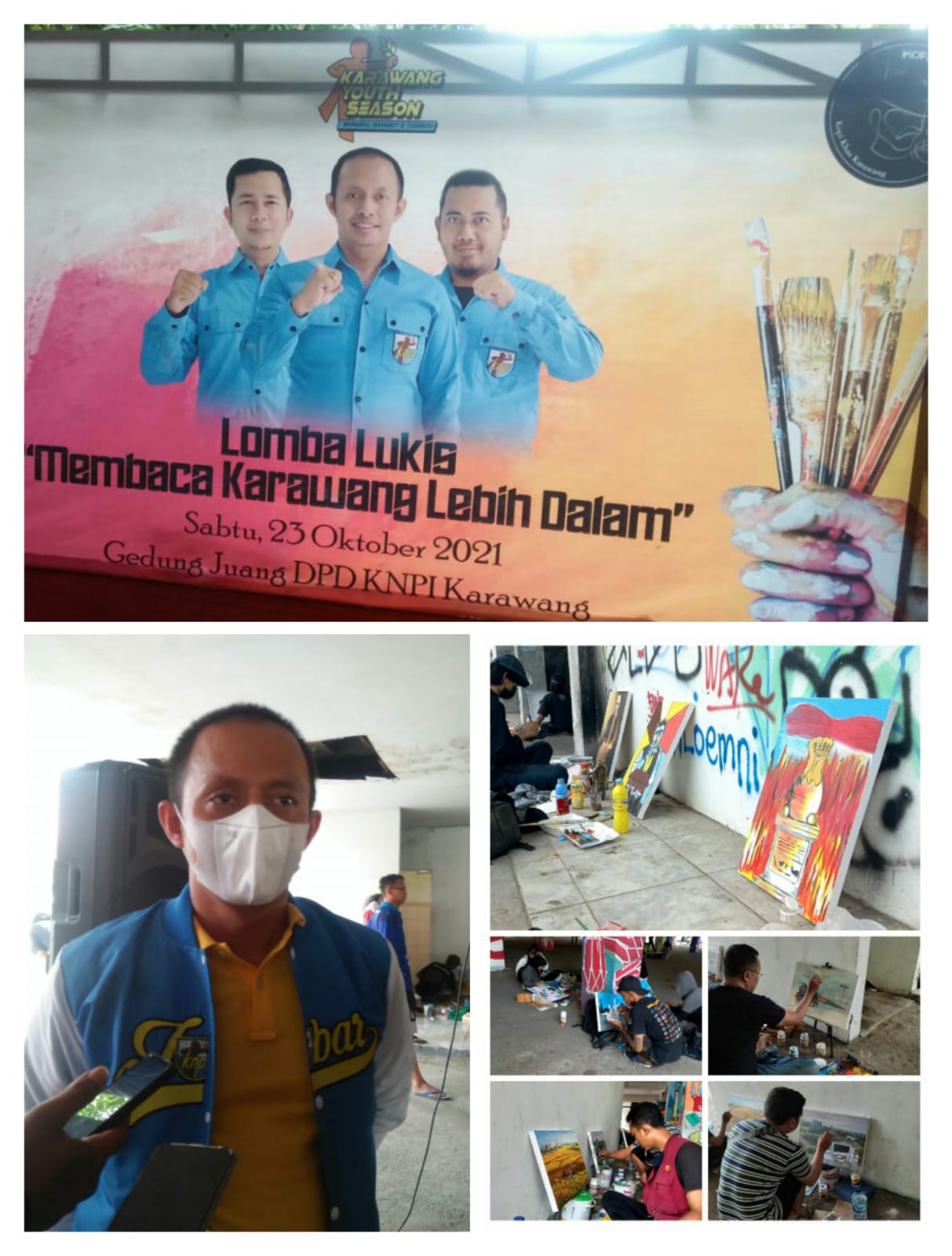 “Hari ini DPD KNPI menggelar kegiatan lomba lukis bertemakan Membaca Karawang Lebih Dalam, kegiatan ini dilaksanakan untuk mewadahi sahabat sahabat seniman lukis di kabupaten Karawang” ujar Guntar Mahardika.