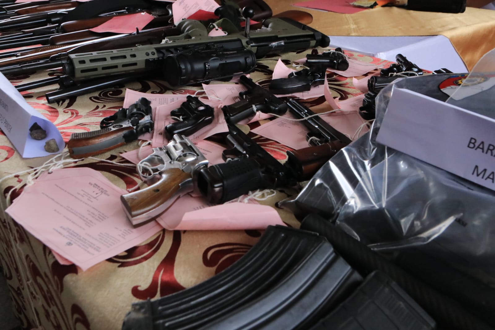 Barang bukti yang berhasil diamankan berupa jenis senjata api diantaranya senjata laras panjang berjumlah 20 pucuk, senjata laras pendek berjumlah 11 pucuk, peluru berbagai kaliber berjumlah 9673 butir, tas senjata laras panjang 19 buah, box peluru 3 buah, magazine laras panjang 42 buah, magazine laras pendek 34 buah dan kaleng peluru angin 1 buah.