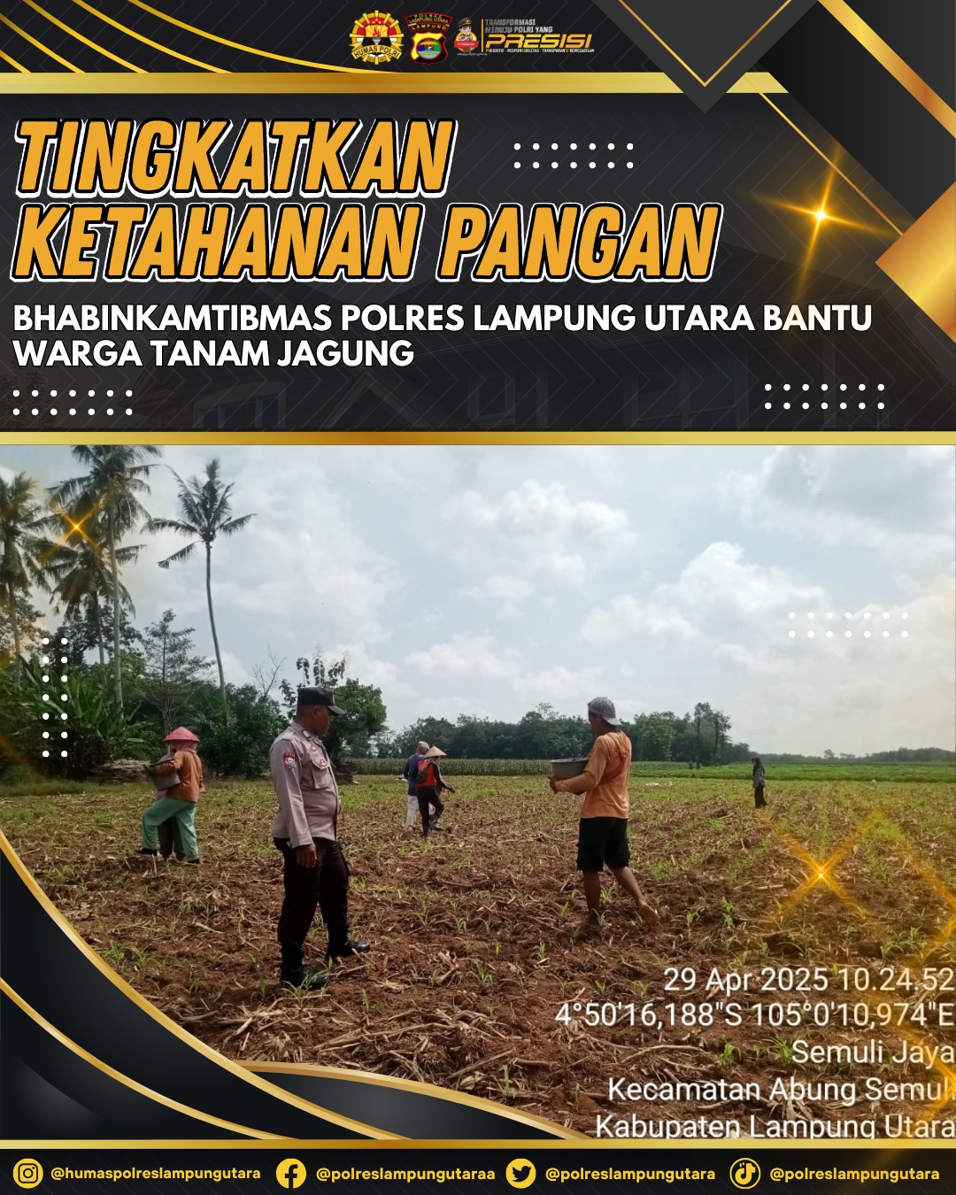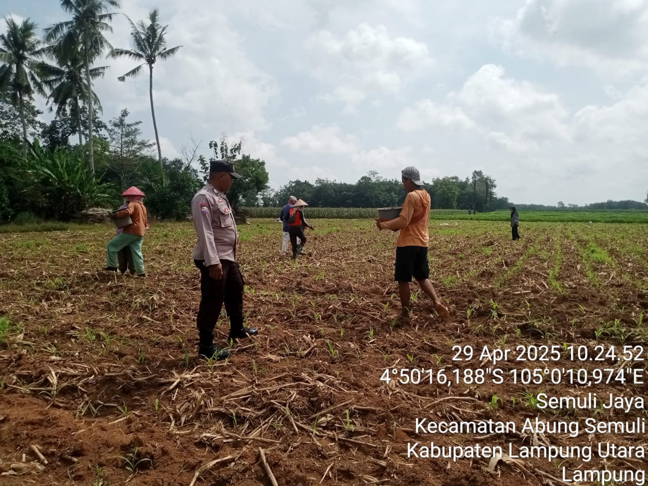 LAMPUNG UTARA II ONTV.CO.ID – Bhabinkamtibmas Polsek Abung Semuli Polres Lampung Utara Bripka Yuli Maryanto membantu Petani saat melakukan penanaman jagung di Dusun Sukajadi Desa Sukamaju Kecamatan Abung Semuli Kabupaten Setempat. Selasa (29/4/25).